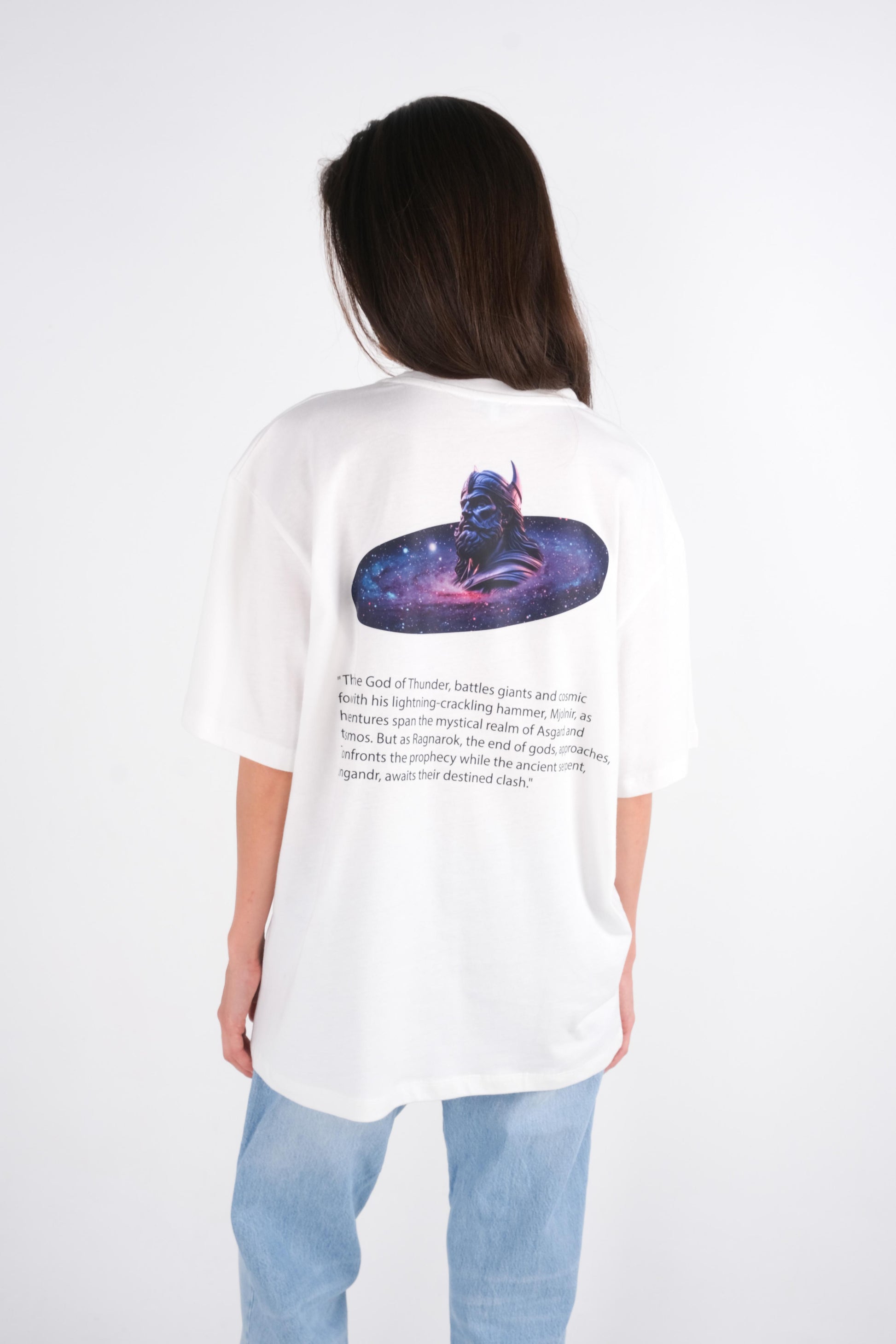 Thor'un yıldırımlar çakan çekici Mjolnir ile dokuz diyara hükmeden gücü, bu t-shirt’te vücut buluyor. Thor Galaxy Oversize T-Shirt, mitolojik köklerden gelen kudreti ve galaksinin koruyucusunu simgeler. %100 pamuktan üretilen bu premium t-shirt, üstün bir konfor ve dayanıklılık sunarken, zamansız bir stilin temsilcisidir.
