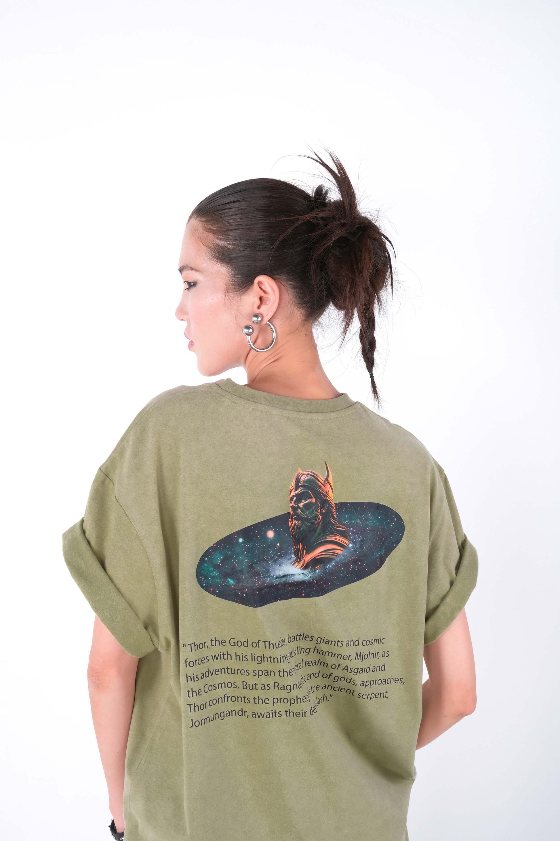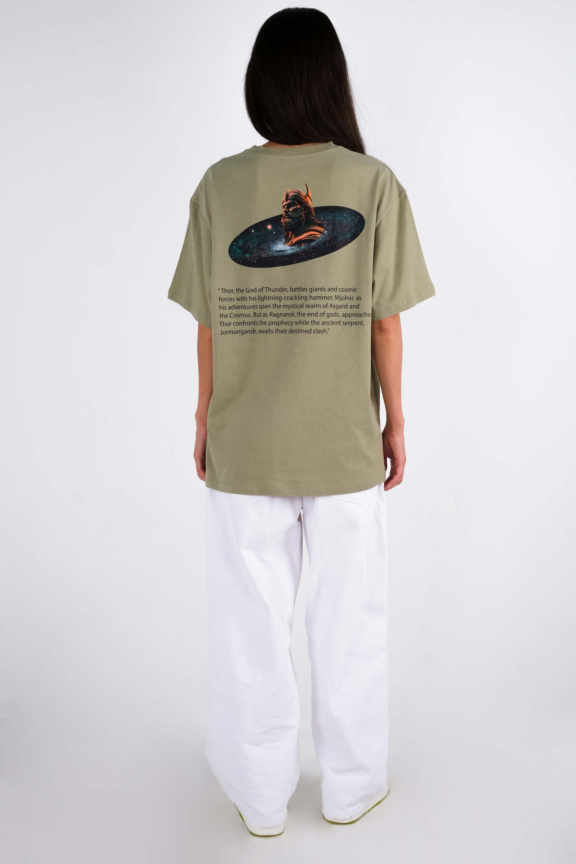 Thor'un yıldırımlar çakan çekici Mjolnir ile dokuz diyara hükmeden gücü, bu t-shirt’te vücut buluyor. Thor Galaxy Oversize T-Shirt, mitolojik köklerden gelen kudreti ve galaksinin koruyucusunu simgeler. %100 pamuktan üretilen bu premium t-shirt, üstün bir konfor ve dayanıklılık sunarken, zamansız bir stilin temsilcisidir.